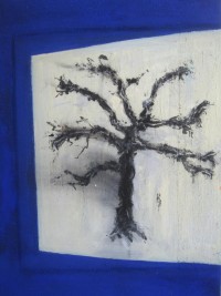 “Vigilance” – Max Hecht This painting describes a special event in the life of Max Hecht. He was 16 years old and doomed to be hanged at a tree in the yard of the camp. The SS soldier left him alive because his own young child had been killed in the battle of Stalingrad a few days before. This tree is nearly dead. It is knotty. However, life is ready to burst from its branches. This tree is enclosed in a window. This window is Life. “Vigilance” is the key word for Max Hecht. (Source: exhibition catalog)